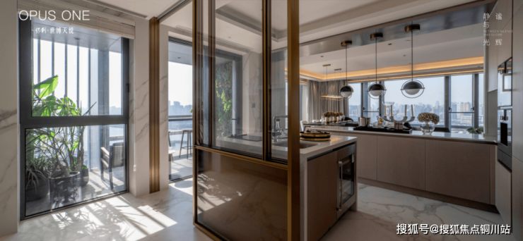 这客厅既是270°全景舱厅,无论全家在餐桌前欢聚一堂,还是孩子们在客厅嬉戏,一抬头便是以江景和城市为主题的巨幅油画。