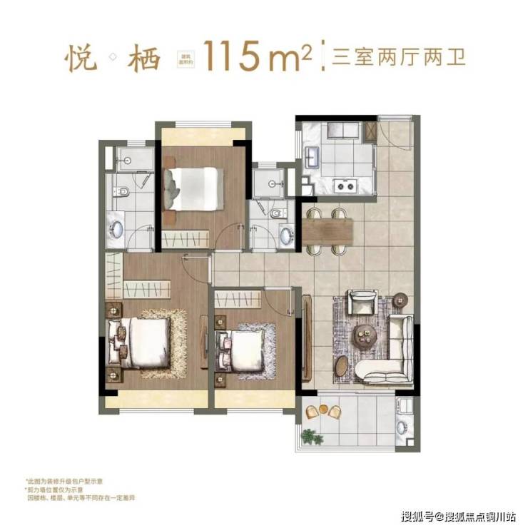 项目建面约115㎡户型,为3室2厅2卫设计,这个户型方正通透,3开间朝南,南向双卧,阳台也是时下最流行的双开间设计,采光、通透性俱佳;餐客厅一体化的设计,打造超尺度家庭厅;