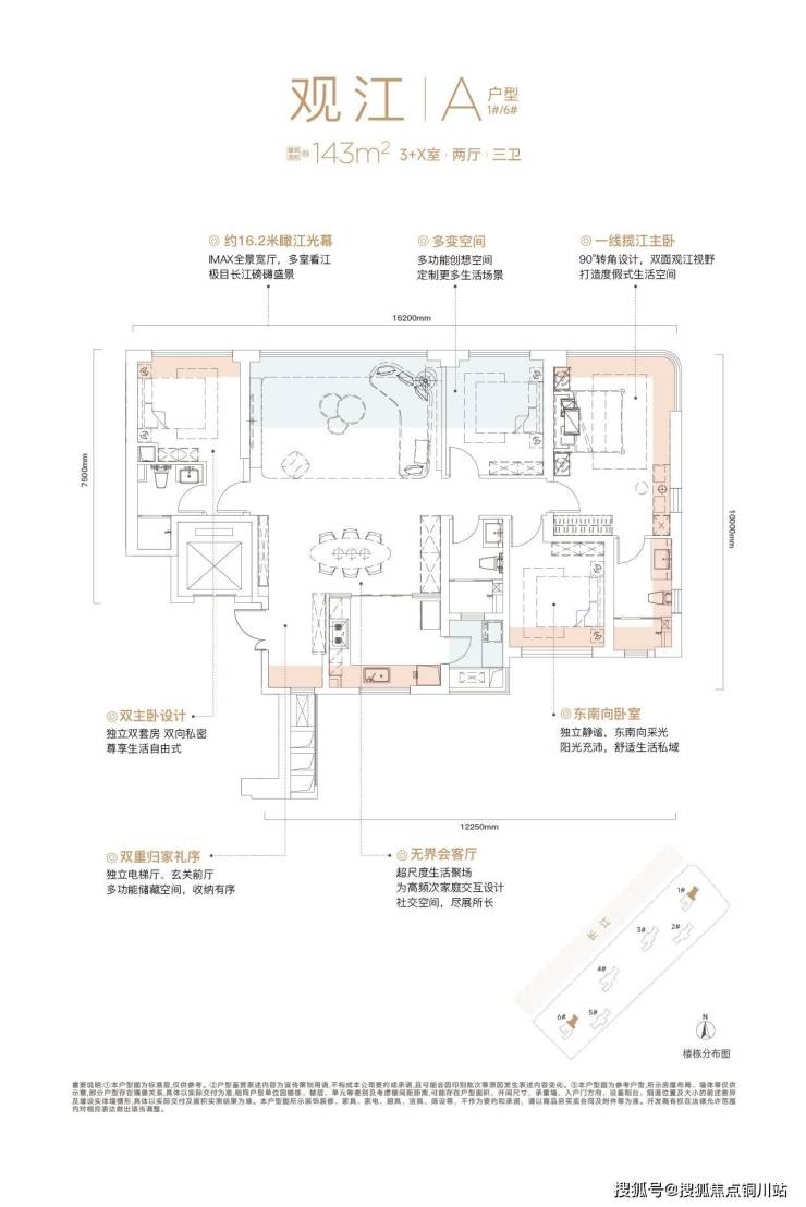 143㎡的经典3+1居室户型,户型面宽可达市面少见的16.3米,创新设计可变弹性空间,约9米宽的大横厅设计,实现更多生活场景可能;同时搭配3卫设计,实现双主卧套房,满足更多家庭使用需求。