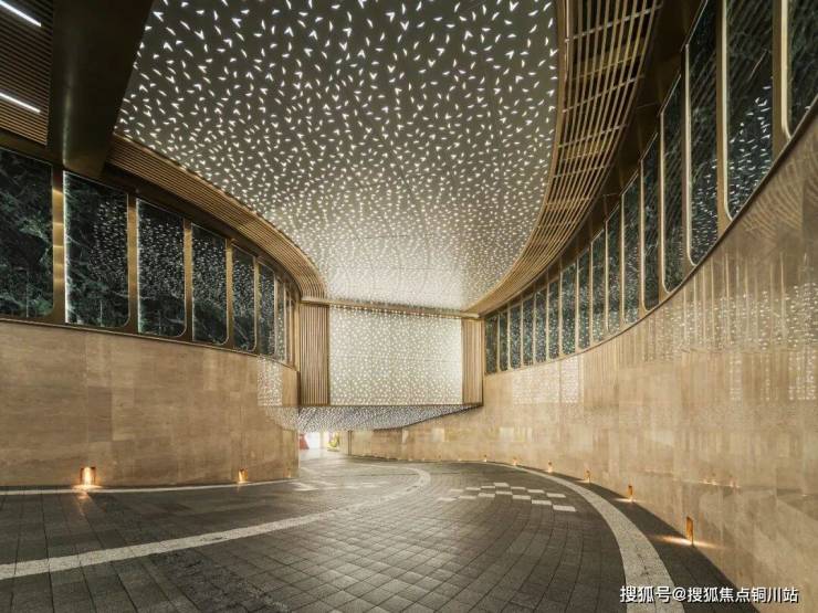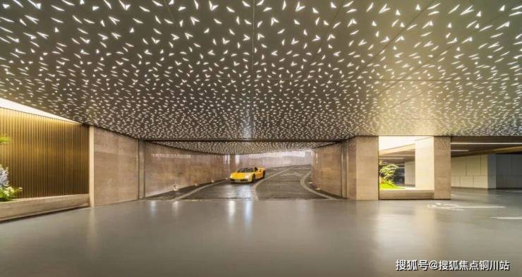 地库出入口,采用星空天幕设计,亮眼的prada绿岩板,配上星光顶和格栅,无界光带如流淌的星河指引前行方向,柔和而明亮的灯光洒在马蹄石地面上,映照出平整如镜的光泽。