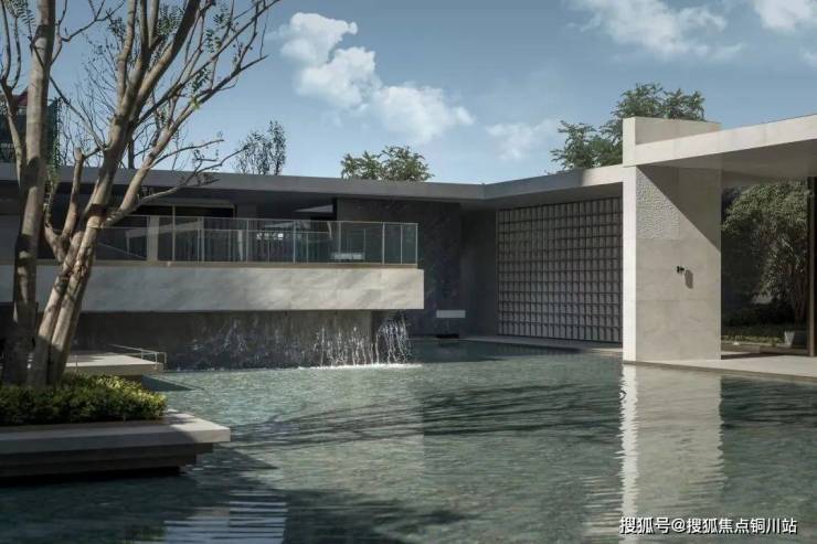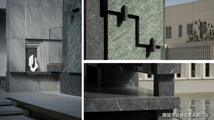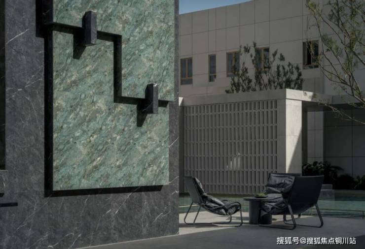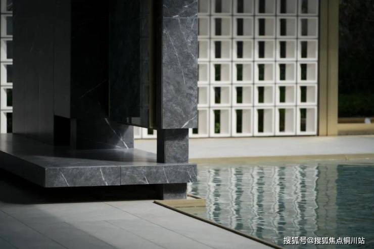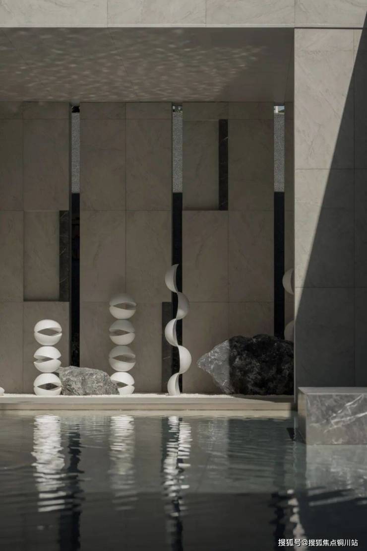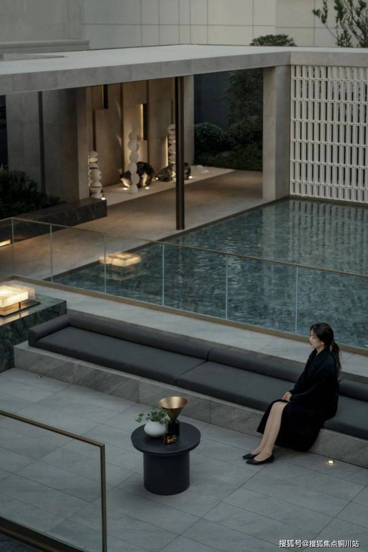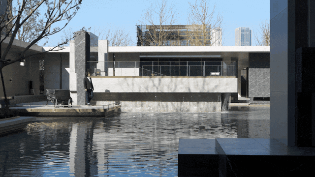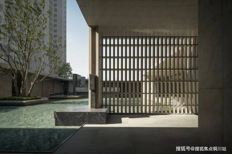沿门庭而入,一碧如镜,理水植绿。格栅与留白手法间隔,以回形连廊围合水院,引领着游人以游园的形式逐一探访水院各色社交空间。