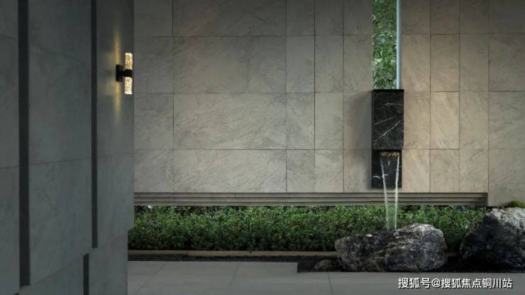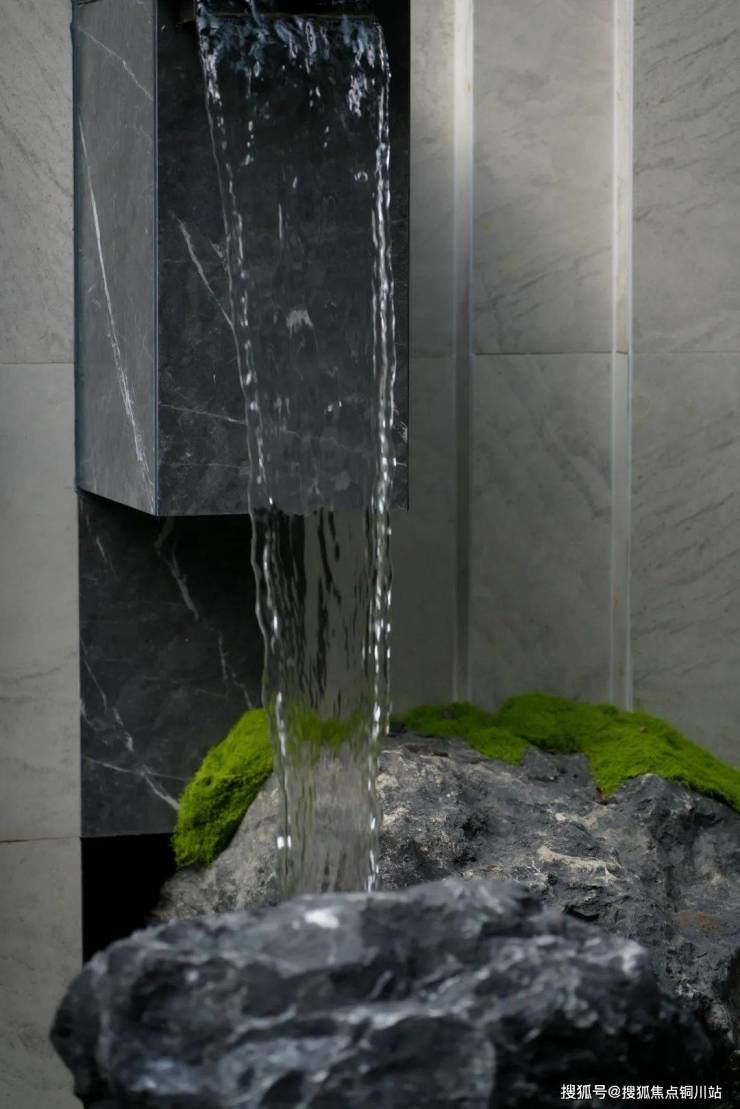 穿林而过,门庭景墙沿着场地舒展开来,仿若画卷,为空间带来流动性和方向感。流水搭配沉石,动与静交融,丰富了门庭感官层次,引人入胜。