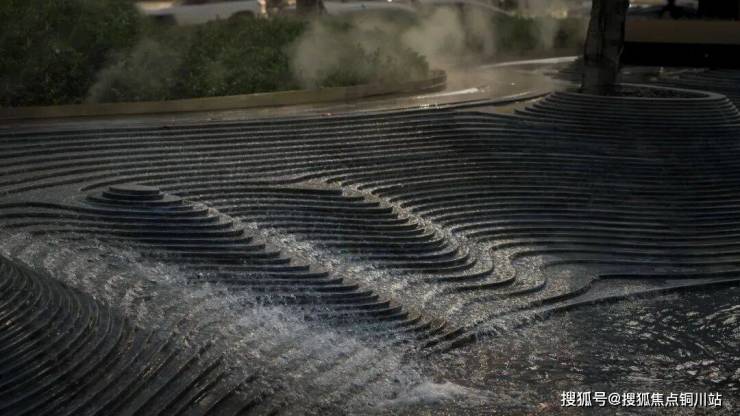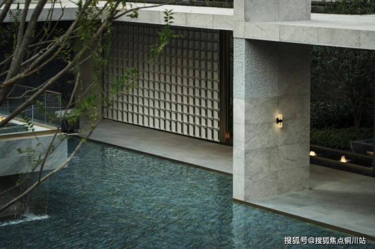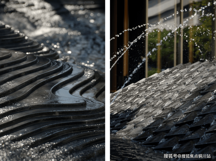 入口空间临街而设,开放式的社交空间形态与层叠水景区域相洽、延展,叮咚乍响之间,空间的活性得以重塑,与街景之间达到了一种自适的平衡感,进可享城市繁华,退可拥青林谧境。