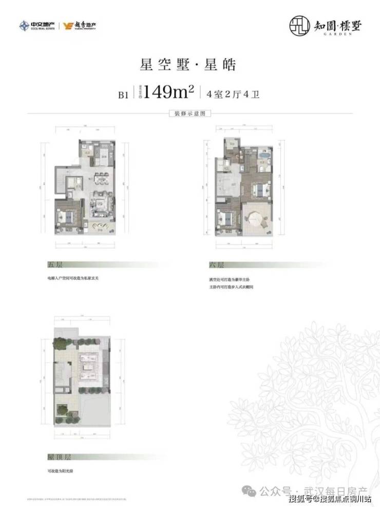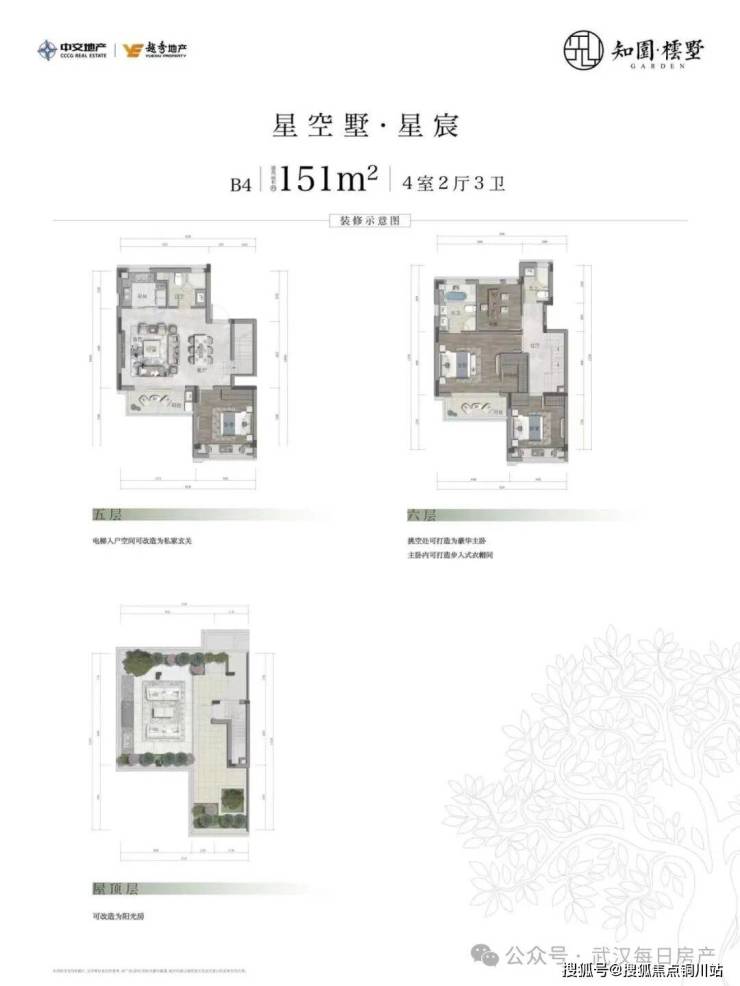 上叠:约144-152平米,独立电梯入户,三层复式结构。上叠中间套,部分户型有六层退露台,约16平米的超大花园露台。屋顶露台超大扩展面积,且飘板设计较大,后期可自行改造利用