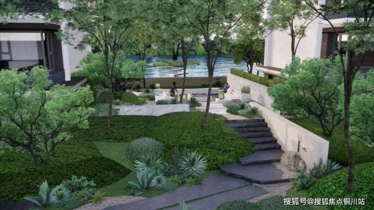 5、11号楼南侧的一、二级阶梯过渡带,以景墙构筑「微型悬崖」,宽敞的石阶从缓坡间延展开。