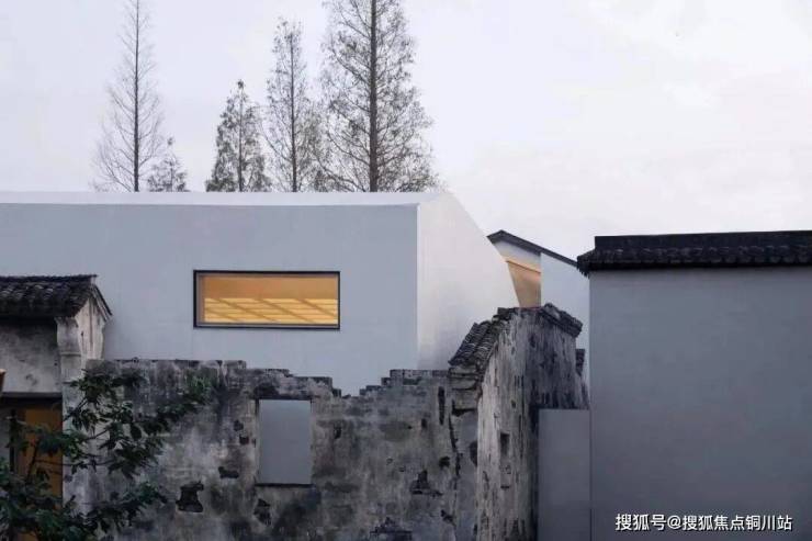 车马亭廊道的横向长窗将树影投射到墙面,与墙面的水景共同呈现自然的意向。