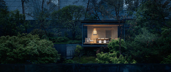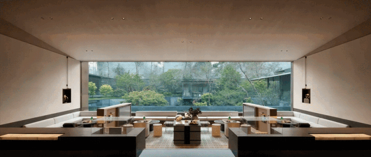 场地占地约2500平方米,建筑环抱庭院,分设上下两层,「生活馆」占据一层主要展开面,14米长、3.2米高的整面玻璃将庭院尽揽无余;「茶亭」则隐逸于自然之中,与生活馆隔空相望,互为景致。