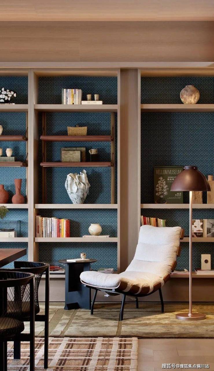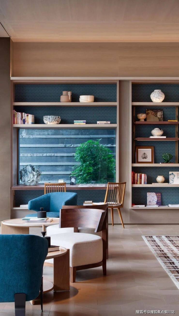 「书吧」用木头营造静谧的空间氛围,人的视线自然地被引向庭院,临水而坐,一杯咖啡一本好书,沉静松驰。