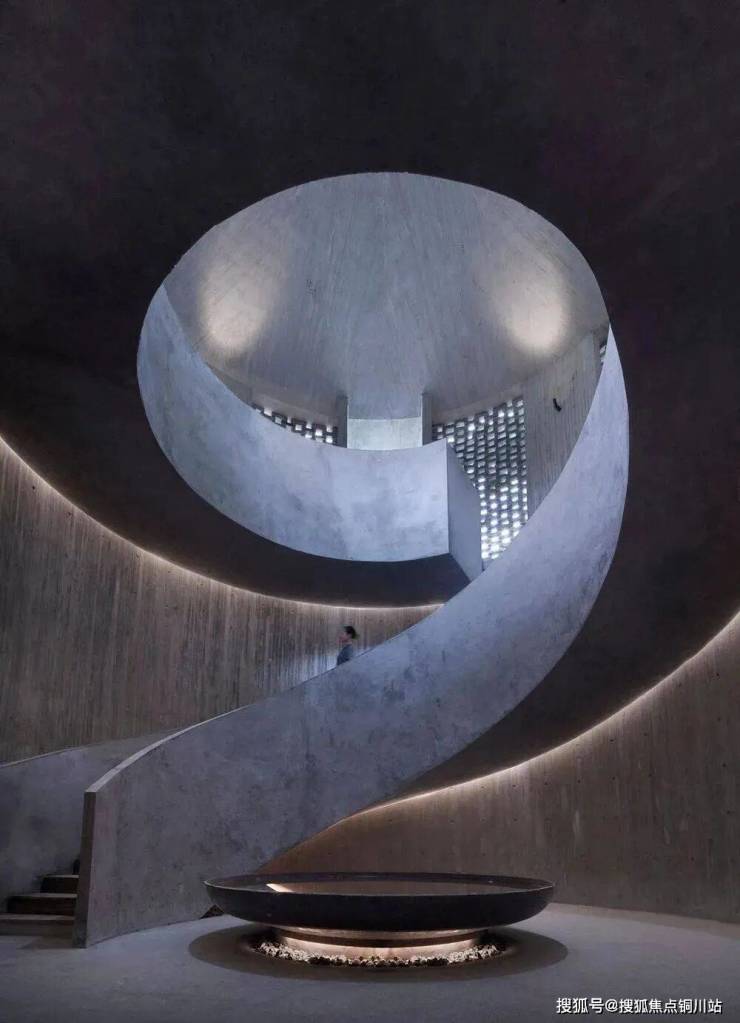 沿艺术楼梯拾级而下,抵达下层空间,各功能盒子以园林式的空间布局分置于自然之中,并用室内游廊串联。