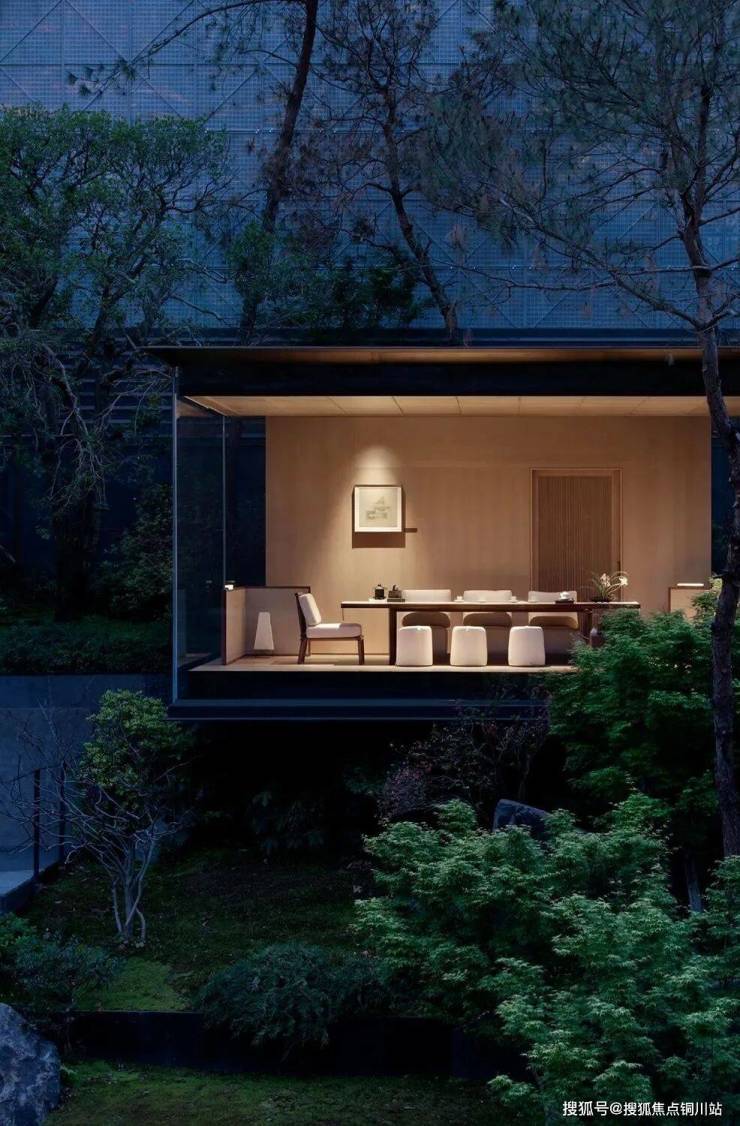 自场地南侧门廊步入,穿过前庭院,城市喧嚣逐渐退却,大隐于市之感油然而生。庭院中山、林、池、泉、瀑、溪、涧、桥……自然意趣错落交织;琴、棋、书、画、酒、诗、茶、香……雅逸生活徐徐展开。