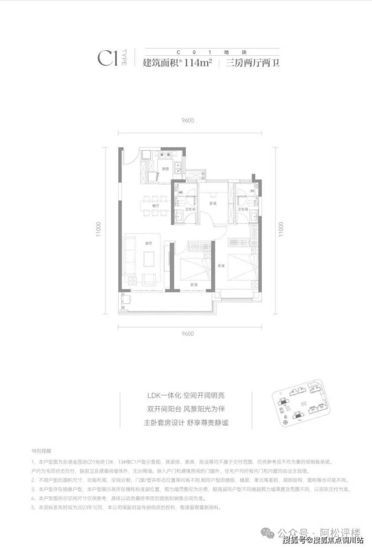 该户型为13号楼中间户,南北半通透,三开间朝南,北部房间对连廊,采光和私密性有一定影响。该户型是传统的三代中间户,比较常规。