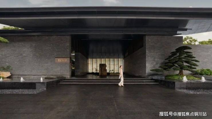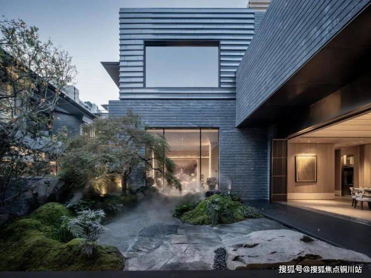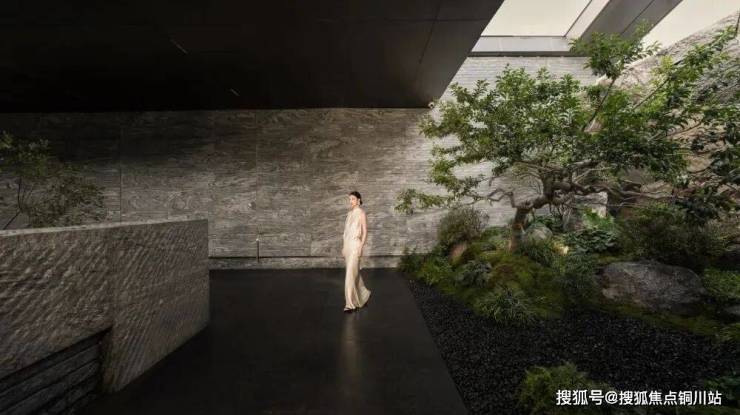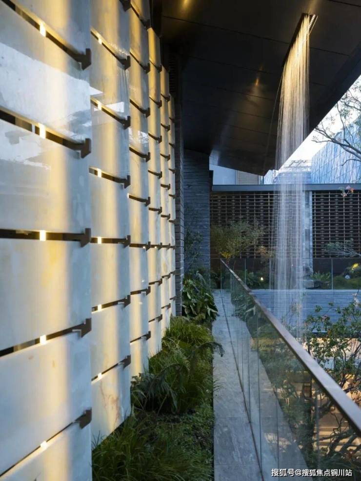 创新下沉庭院,结合叠水与高差,形成“峰谷”意象。水流层叠跌落,其声淙淙,望峰息心,窥谷忘返,隐喻家族如山水般源远流长的气度。