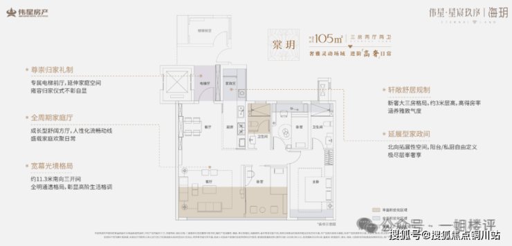 其中,最小户型建面约105平做到大三房两厅两卫,让你首次置业就有改善大户型的空间尺度。