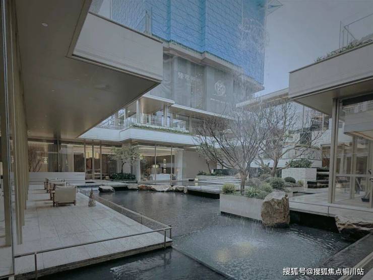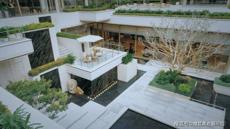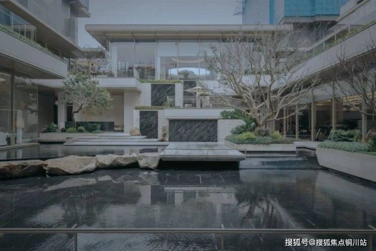 下沉庭院采用大面积静水面结合造型树的方式打造,同时局部设置叠级分台的方式增加空间的层次。