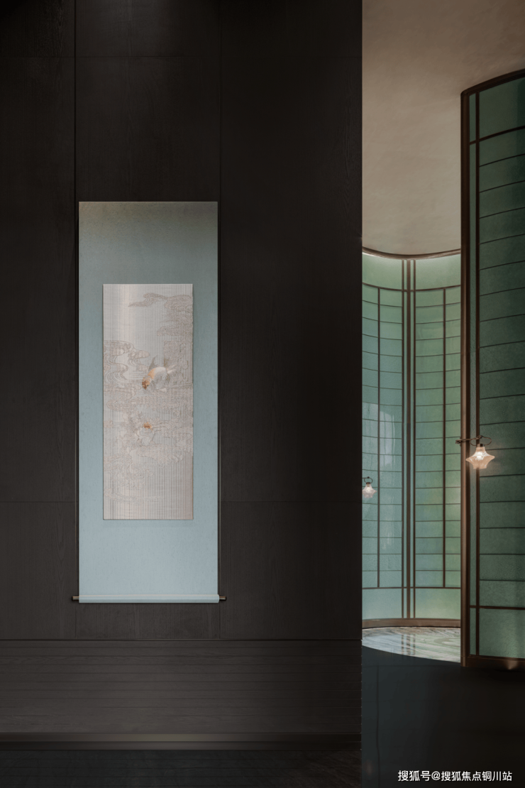 转入项目沙盘,贝母漆弧形屏风垂若运河帆影,半围合空间似舟泊岸。中央沙盘白玉嵌金勾勒合院群落对墙苏绣以太湖石晕染惠山雨雾。