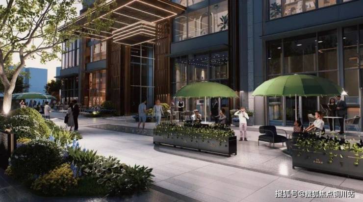 门口有口袋花园,地块外围的轻商业裙带,结合绿植景观融入周边,紧接着的社区大堂,承接空间过渡,又提供遮阳避雨的实际功能,完成归家情绪的铺垫。