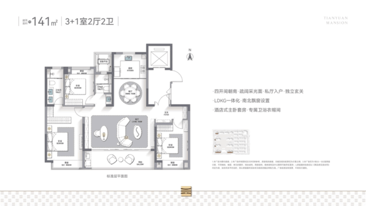 建面约141㎡小高层:入户有独立玄关,并配备收纳空间;四开间朝南,LDKG一体化设计,超大南向面宽;南北都带飘窗,居住舒适度大大提高