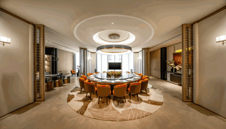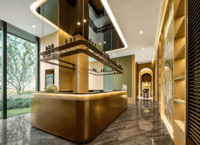 环岛落客设计、爱马仕灰大理石景墙和顶部古铜色的“华盖”设计,第一眼确实有种到达豪华度假酒店的既视感