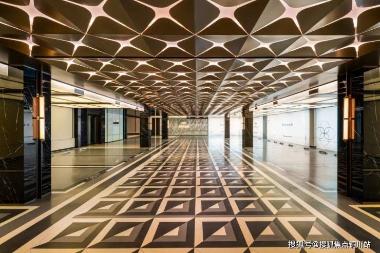 地库蜂窝铝板平顶和拼花地面遥相呼应,两侧深色岩板墙面,收缩视觉焦点,一眼看过去,是很极致的视觉享受,品质感拉满