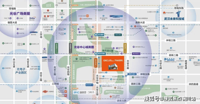 大型商圈:周边商业氛围浓厚,被多个大型商业体环绕 。距离项目几百米处,有正在建设的光谷五路地下空间走廊,官方回应高新二路以北预计 2024 年 6 月完工,高新二路以南预计 2024 年年底完工 。此外,规划中的龙湖天街也近在咫尺 。车行 5 分钟可达已开业的武汉大悦城,10 分钟内可至首创奥特莱斯、山姆会员店 。1 公里半径范围内,还有在建的瑞安 “天地系” 光谷新天地商业街 。