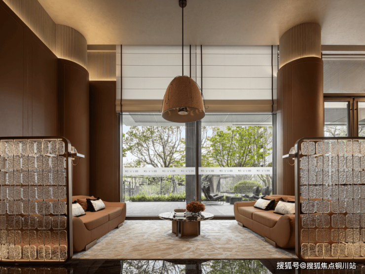 会客厅一层打造为业主与访客休闲小聚的优雅场所。中部水吧中心提供酒水、咖啡、茶点服务,全开放推窗可充分引景入内,营造惬意的休闲场景。