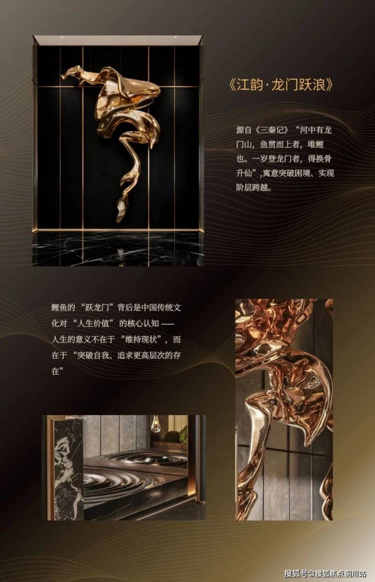 鲤跃龙门的动态过程与随之腾跃的流水形态被固化在不锈钢材质内,底部组件与上方悬吊部分相互呼应,“鱼龙潜跃水成文”的景象尽收眼底。一幅融文化内涵与现代美感的江幕画卷,预示着跨越与尊荣的人生于此处正式启幕。