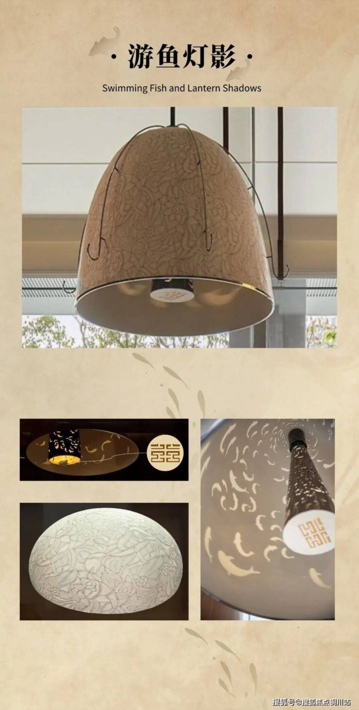 洽谈区上方悬挂的是走马灯式的复古罩灯。灯罩上印制花团锦绣纹样,内部走马灯罩镂空雕刻锦鲤鱼图样。当内部走马灯转动,群鱼游戏的画面便跃于外灯罩内壁。设计师的别出心裁为奢美大气的洽谈区更添几分富丽灵动。