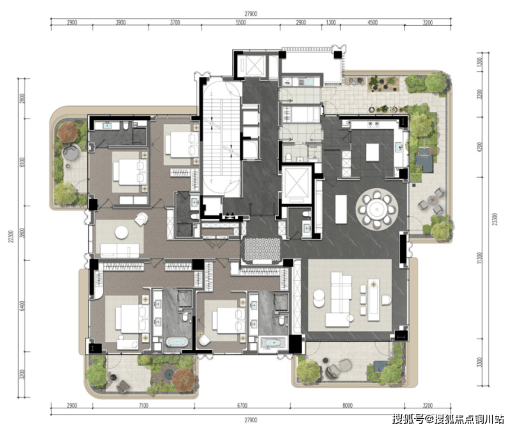 该户型实现了四面全维度外景,四个主题空中庭院分别与客厅、餐厅、厨房及卧室深度融合,让庭院功能与具体生活场景精准匹配——客厅旁的社交型庭院兼顾观景与聚会功能;餐厅旁的庭院适配于下午茶、早餐等休闲场景;厨房外的庭院可种植葱蒜香草,可供家庭烹饪时的佐料;卧室配套的庭院则确保了私密、宁静的休憩时光。