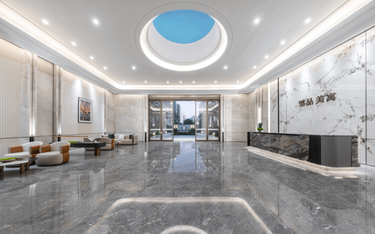从地面墙面的铺装,到顶部对称造型的吊顶,让宾至如归的仪式感,贯穿所有的归家动线。
