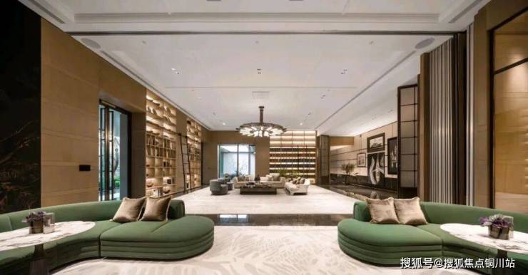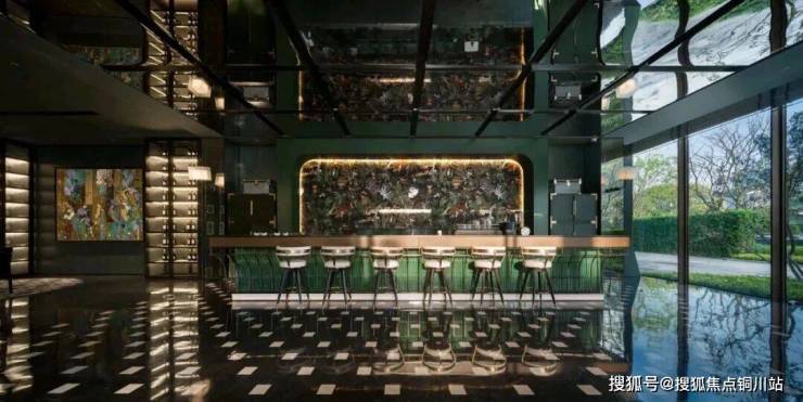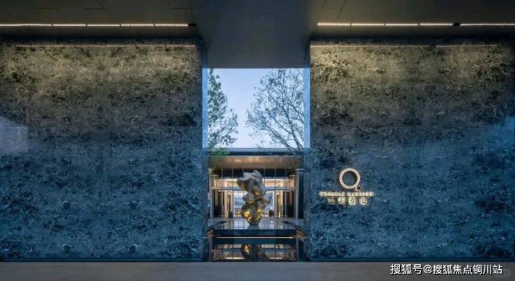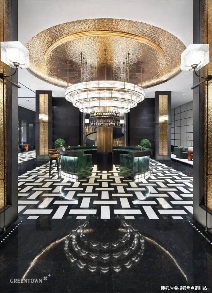 在百米长的廊道中,奢华与自然的绿意和谐共处,营造出“生活入境”的景致,室内外界限变得模糊。园区入口大厅的墙面和地面选用天然石材,温暖的色调给人一种温馨的感觉。大面积的PRADA绿色奢石墙与意大利宝格丽品牌的绿色景观墙相映成趣,营造出一种沉稳而优雅的氛围。入口处的艺术装置“碧海潮生”,以安哥拉黑色手工制作的水钵为核心,独特的组合方式和尺寸设计展现出丰富的层次感,向意大利建筑大师卡洛斯卡帕致敬。