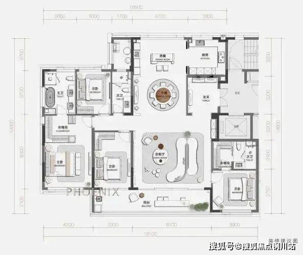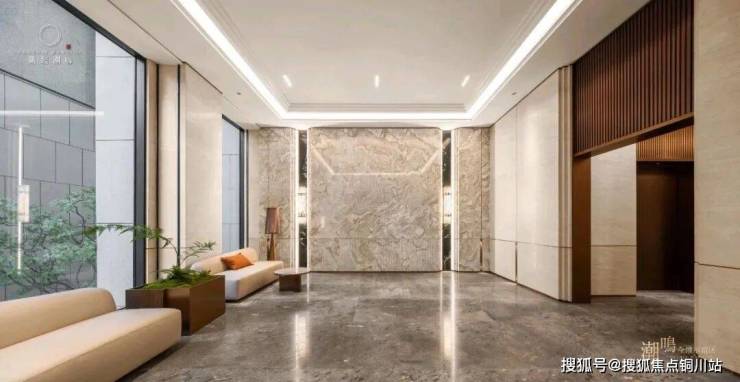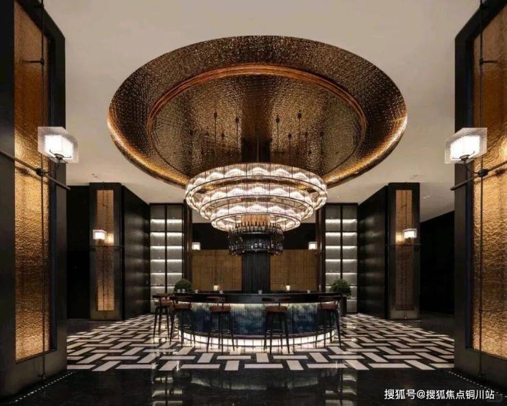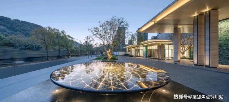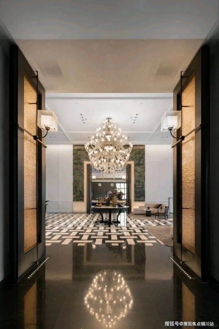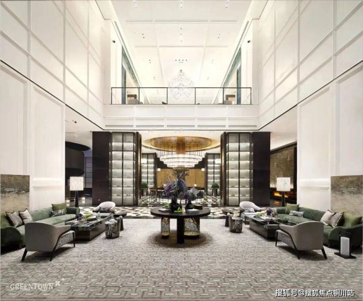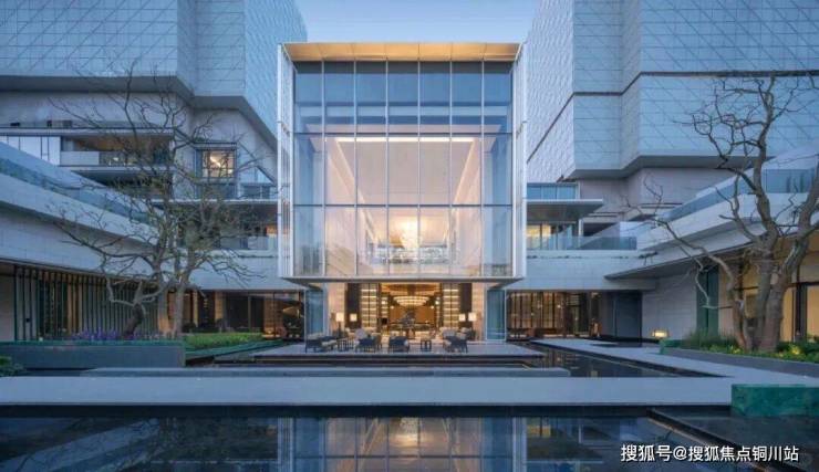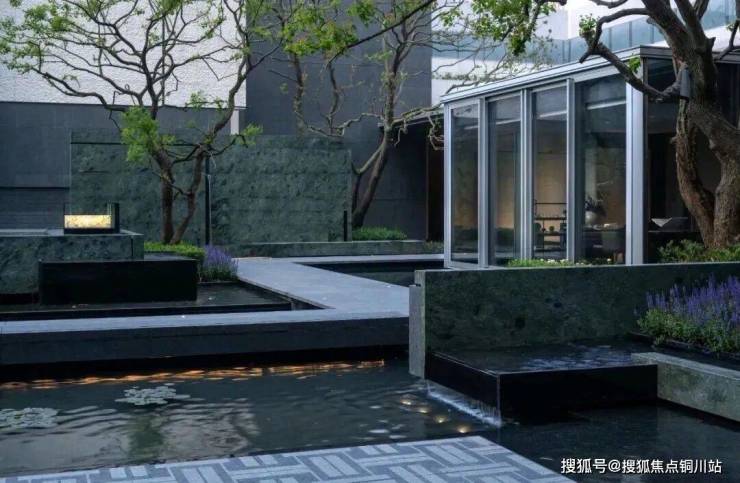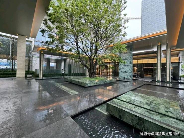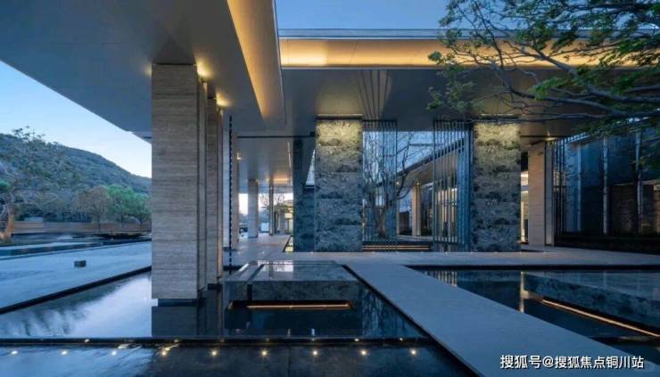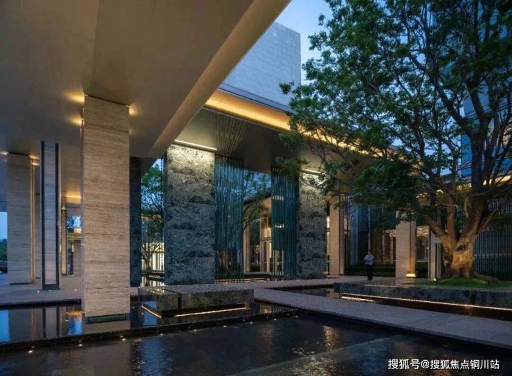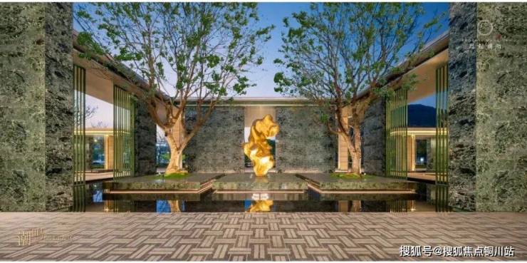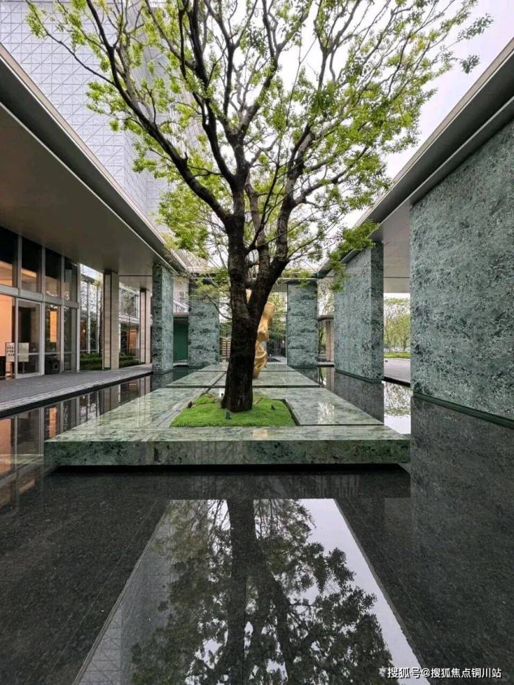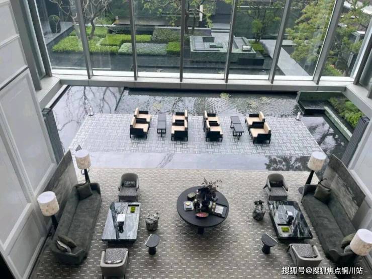 大堂的挑高约15米,作为回家的过渡空间,连接着会所和下沉庭院。下沉庭院面积约960平方米,设计灵感来源于山水城市,巧妙地设置了六个叠瀑和五道豪华的石片墙。庭院内种植了大量树龄约50年的乌桕,这些树木是从全国各地精心挑选而来。曲水流过,留下芳香,游走其中,宛如置身于“独自洗涤苍苔注入云壑,白鹤飞翔绕过青云”的闲适意境。