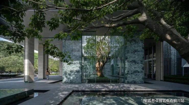 踏入这片园林,四周的水流环绕,仿佛融入一幅动态的画卷。以金山艺术雕塑为中心,九个水院环绕周围,两侧散布着百年古树——沙朴,为景观增添了几分古朴的气息。潺潺的流水声在耳边回荡,眼前是深深浅浅的绿色。这里生动地展现了“蝉噪林逾静,鸟鸣山更幽”的东方意境,让人感觉如同置身于山水之间。