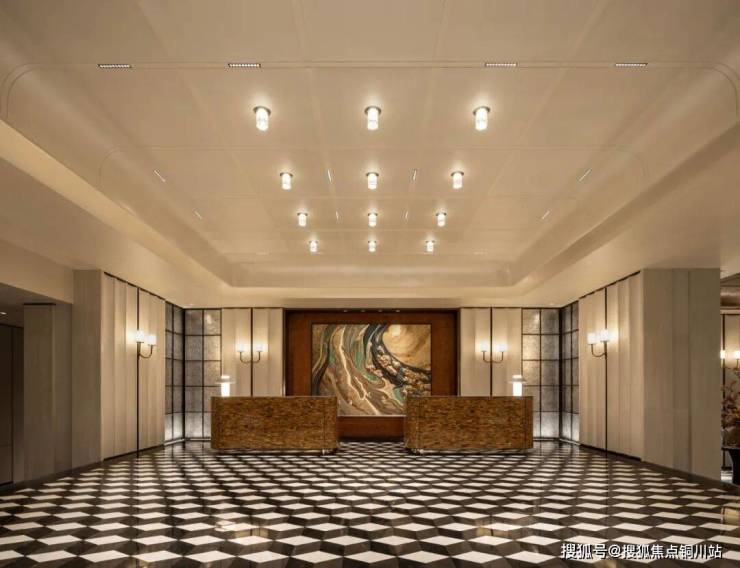 步入门庭,云石吊顶之下,借鉴中国古代建筑中的“藻井”做法,由522片皇家白玉石材拼接而成,凝聚光华,辉映时空。华光之下,中心水池承托起艺术雕塑,莹润皎洁,宛若珍宝。立面则采用铂金钻奢石,搭配墨绿荷塘月色奢石、安哥拉黑奢石花钵、以及手工锻造的巨幅铜门,流淌出一抹温润质感。