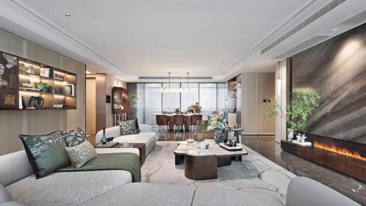 门厅仪序感浸润艺术灵感,奢石、工艺用材精细雕琢,入户尽显大宅品位。客厅双背景墙,奢石的自然纹理与木的温润触感,将海派摩登质感在精微细节处尽致表达,框定空间的美学欣赏焦点。