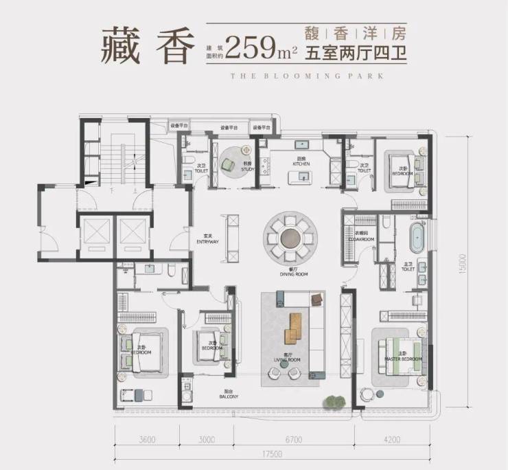 建筑面积约259㎡方正大五房,南向约17.5米大面宽,通风、采光居住舒适度提升。私享礼制玄关空间,彰显大宅优雅归家气度。LDKB通厅设计,约90㎡社交公区;3+2套房的酒店式居住奢享,家庭成员各有私属的生活空间,实现空间平权化,满足四代同堂居住理想。