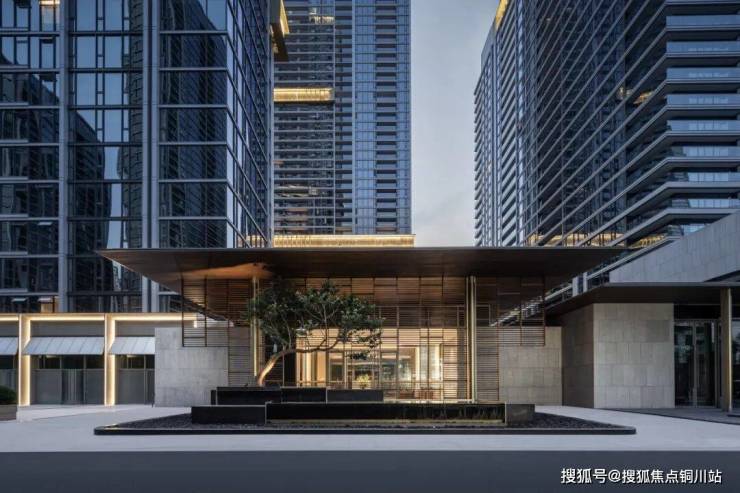 外立面运用国际视野和审美,设置竖向型材线条加强挺拔感,展现长江波光浩荡质感,以大江大河气韵,致敬土地文化。搭配“风帆”塔冠造型,融合鎏金腰线瑞字纹穿孔铝板,成为瑞府藏家身份的专属昭彰。
