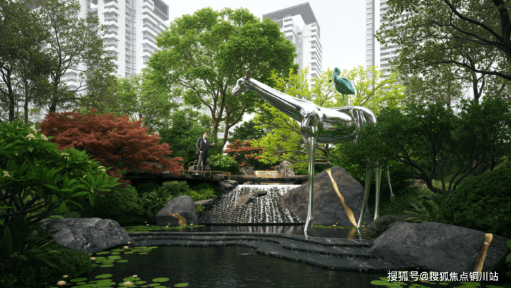 作为“千湖之城”。其历史脉络与人文精神始终与水相融共生,因此景观设计中以“水”为核心叙事线索,将其多元形态转化为可感知的空间语言。通过提取山涧溪流的自然形态,将其抽象演化于艺术构筑、高差处理与雕塑线条之中,形成富有张力的视觉体验。同时,结合东方美学的静雅意境,将水的动态与静态、具象与抽象融于每一处场景。茂密的植被在光影缝隙间自在延展,将都市的喧嚣温柔隔绝。精工金属线条与石材肌理相映,叠级水景调和动静节奏,共同构筑一幅“静而有序、雅呈隐逸大美”的归心画卷。