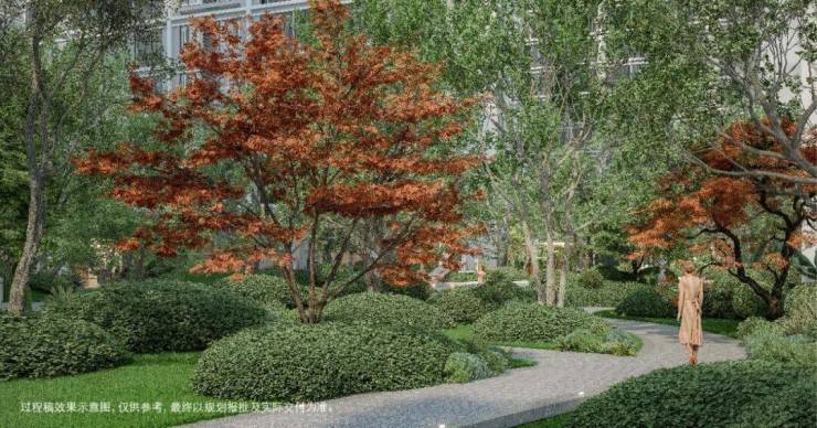 区别于常规的绿化数据追求,在保证自然覆盖率的基础上,创新营造上木层、中木层、下木层、地被层、特色植物层、季相色彩层,六重多层次珍贵林木形成的系统性园林景观,形成移步换景、四季风光俱佳的观景体验。