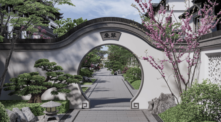 园中设置多处月洞门,园林景色犹如“嵌”在门框之中,彰显妙韵天成的意境之美;次入口布置传统园林中的垂花门、五福捧寿地雕、石笋景观等,对称式的布置手法带来强烈的归家仪式感。