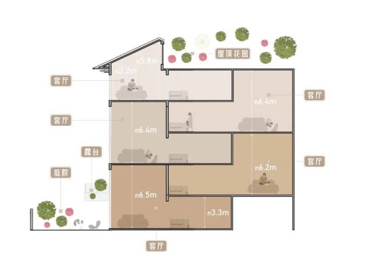 不仅如此,在局部露台外,绿城同样对屋顶露台做了大幅度提升,为居者倾力打造一处“专属的屋顶花园”领地,西组团顶层坡屋面客厅最低处层高约3.1m,最高处层高约5.8m。
