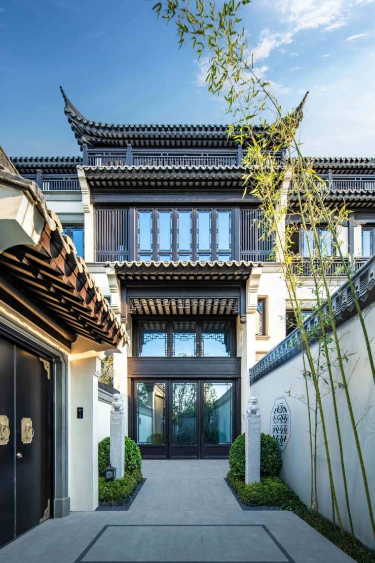 整体立面复刻江南中式典型的青瓦白墙,其中颇为重要的瓦作,特别采用杭州西溪雲庐同款小青瓦,包括屋面瓦、花边滴水、屋脊、戗角等,而这部分工艺也全部出自香山帮匠人纯手工打造。