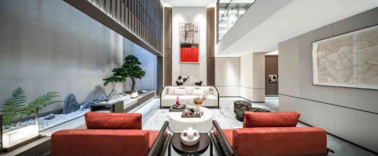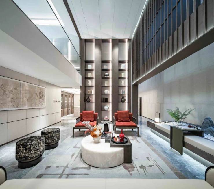 三进空间须弥天地,造景手法借鉴苏州留园中的古木交柯,中心设置须弥座景观池,点缀照壁及石笋景观,寓意小中见大,海纳天地,巧妙呼应国人的天人合一世界观,于归家之际开启一场心灵上的净化之旅。