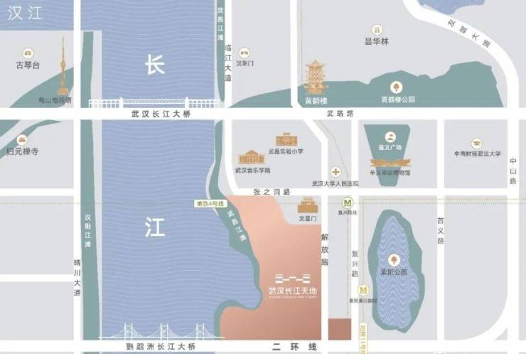 武汉长江天地位于武昌区张之洞路与临江大道交汇处,正武昌湾、黄鹤楼畔、音乐学院旁、鹦鹉洲大桥桥头堡,地理位置十分优越。