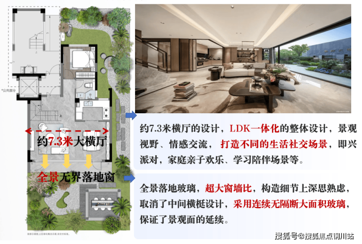 而约7.3米的大横厅+全落地窗,无界融合,庭院景致直接“闯”进客厅,重构墅居生活仪式感。