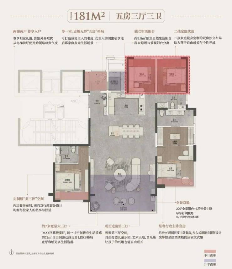 长沙润府历时一年重磅打造建面约181㎡央景宽幕大平层,在整个大盘的3000多户里,本次加推的建面约181㎡户型配比不到1/20,对比市面同等面积段的产品,能做到五房三厅、南向58米楼距、全景阳台\主卧、二孩平权房、志趣第五房等诸多创新设计,可谓全市罕有。