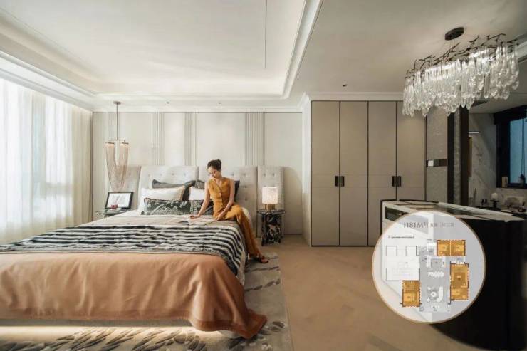 建面约181㎡产品打造出“类三套卧”的起居格局。约29㎡全景主卧套房,对标星级酒店总统套房的空间格局,南向全景落地窗/飘窗,步入式衣帽间,独立卫浴空间,一气呵成的洄游动线设计,让主人家晨起梳妆、沐浴更衣优雅流畅。