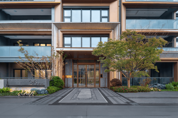 项目远观即具辨识度,这源于对设计语言的极致兑现。香槟金色铝板通过约45°斜切工艺,在光影下形成丰富的层次;独创的“展翼飞檐”屋顶以现代技艺复刻中式神韵;局部高达约35%的窗墙比与约270°环幕窗面设计,不仅塑造了建筑的通透美感,更将“IMAX级”采光视野真实赋予生活。