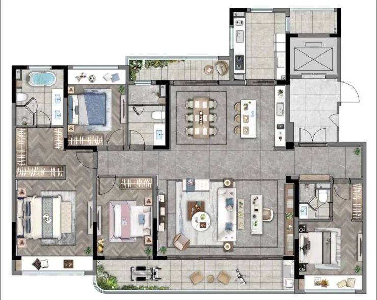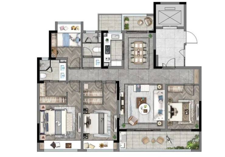 主卧采用套房设计,可布置独立衣帽间,“老人房”与主次卧分区,共享景观,互不干扰。