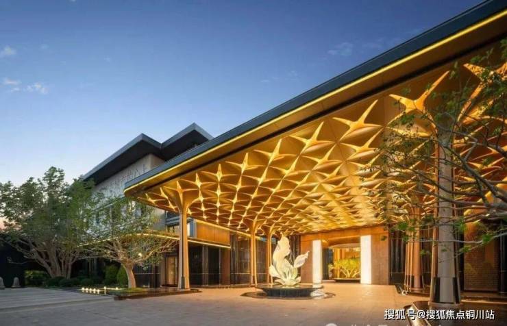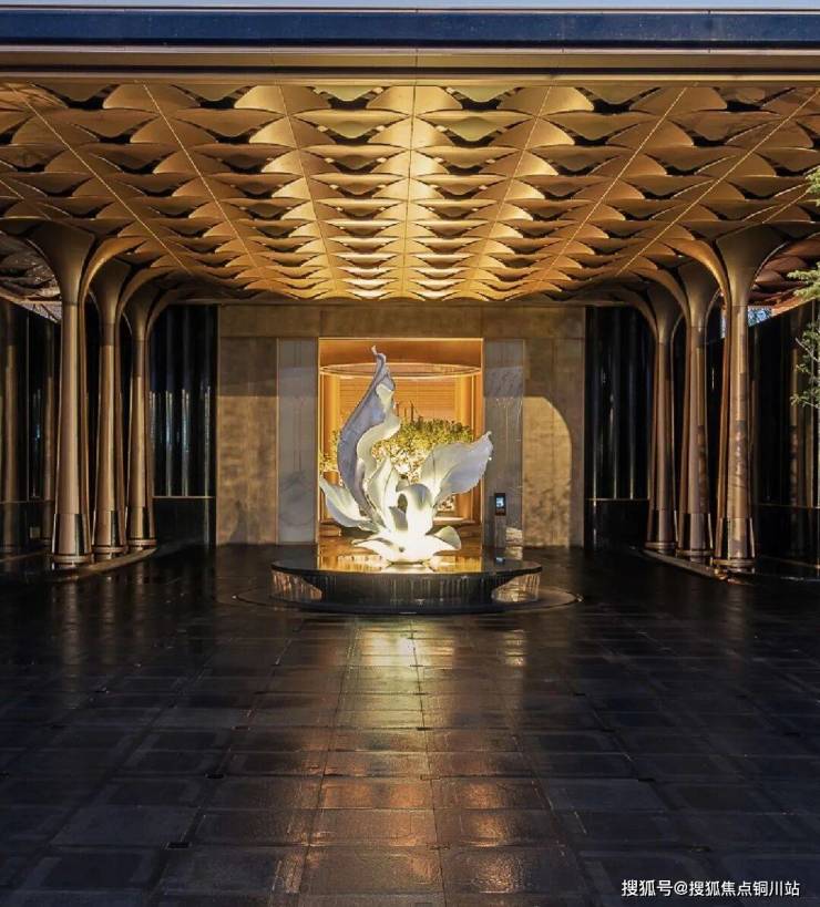 小区大门设计独特,细节之处彰显匠心。门厅之上,金碧辉煌的吊顶由超过200片精雕细琢的百合花瓣拼接而成,支撑其下的,是8根量身定制的百合花柱,中央更有一座巍峨壮观的百合雕塑,百合元素贯穿其中,引人入胜。在材料选择上,尽显奢华质感,精选名贵石材,如入门两侧水景之间铺设的福鼎黑花岗岩地面,景墙则选用了宝格丽绿石材搭配金属格栅,并以进口幻影蓝石材和白雪公主玉石巧妙点缀,尽显高贵气质。