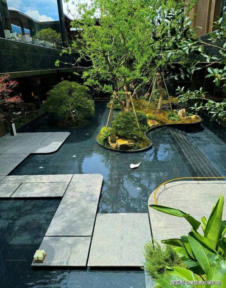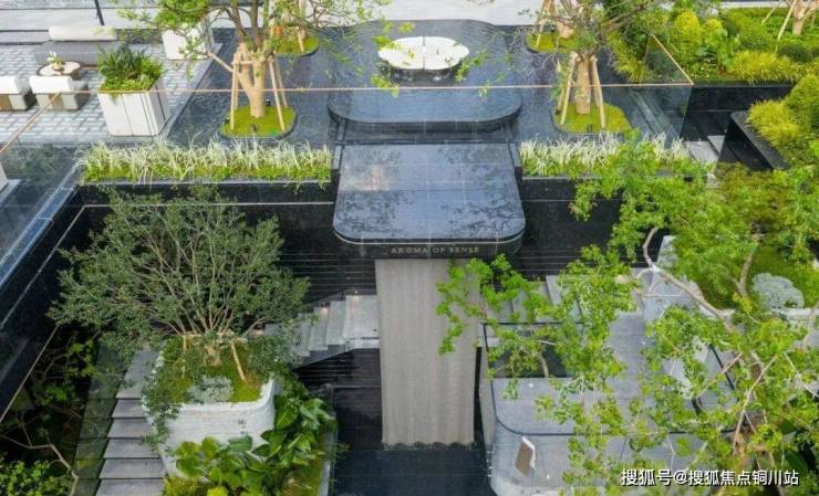 下沉式庭院与一层地面高差达5.2米,巧妙利用高度差与围合设计,打造了一个立体花园,层次鲜明,美不胜收。飞瀑如丝带般串联起地面与下沉空间,辅以阶梯式绿化与错落有致的镜面树池平台,营造出强烈的空间立体感。庭院的选材同样考究,如瀑布两侧挺拔的老桂树与水池中的羽毛枫,不仅美化了环境,更蕴含着美好的寓意,每一处细节都经过精心打磨,品质非凡。